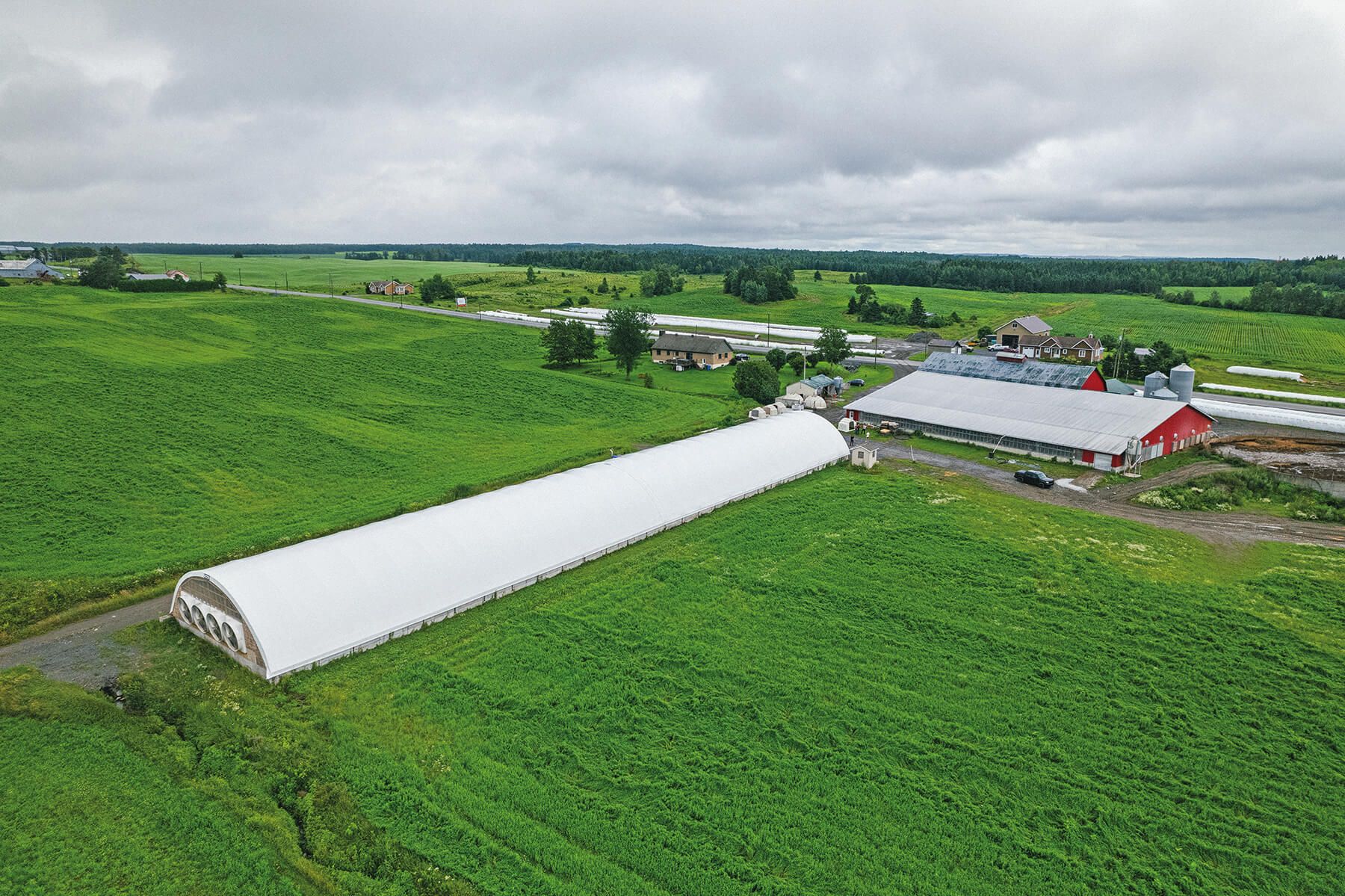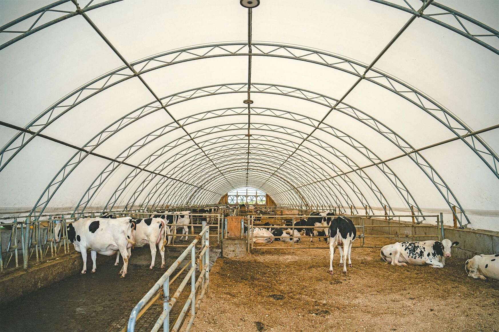 Francis and Stéphanie needed an incremental and flexible solution to house their heifers and dry cows, so they reached out to J.P. Binette Inc. to invest in three Norseman fabric buildings. They purchased the first one in 2022, a structure with double arches and ideal dimensions for their storage needs: 140 feet in length and 50 in width. As they were pleased with their Norseman fabric building, they acquired two more in 2023, including one the same size as the first structure. These new additions are used as cold housing for cows that are currently not being milked. This way, the animals are protected from the elements year-round.