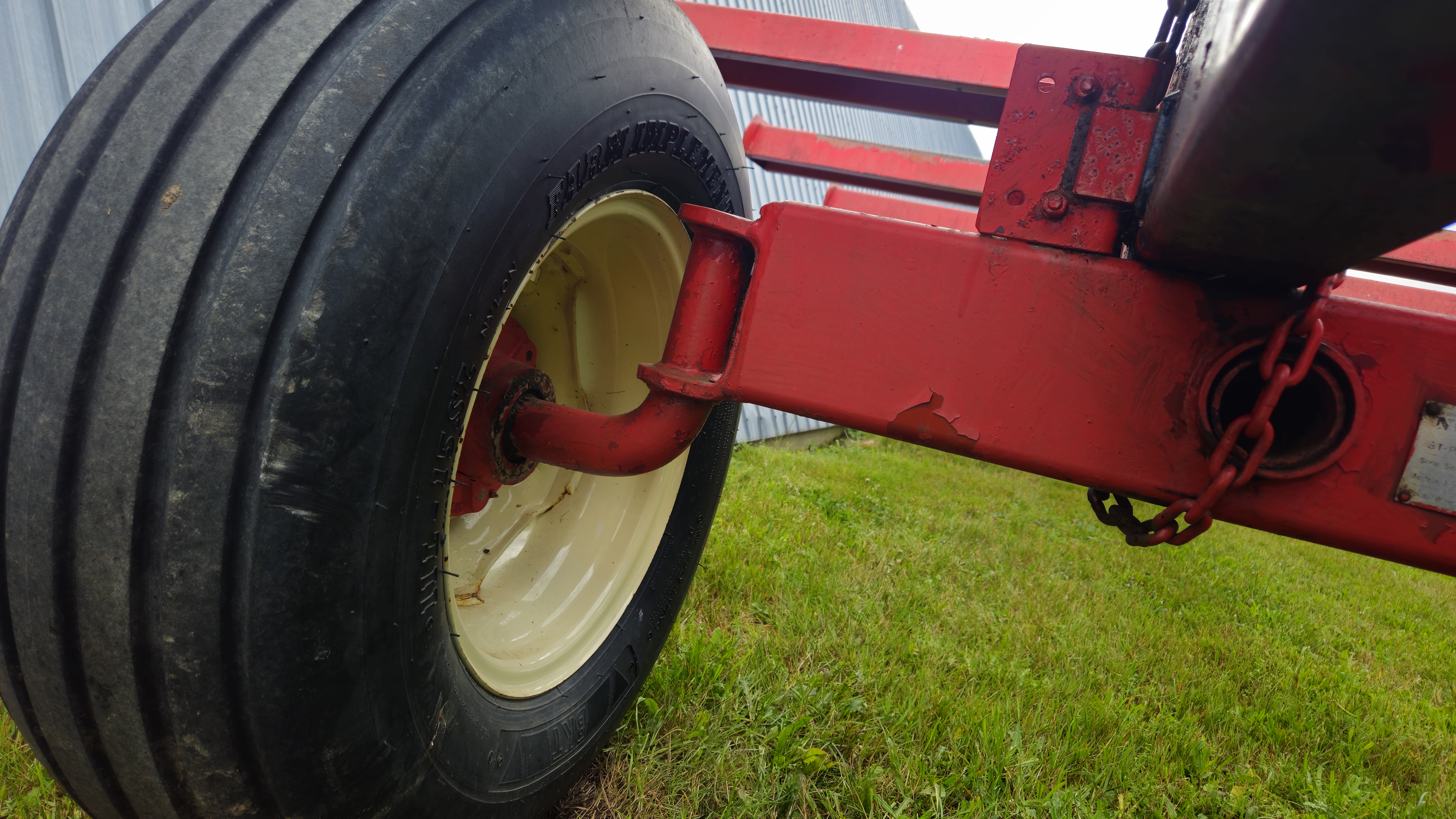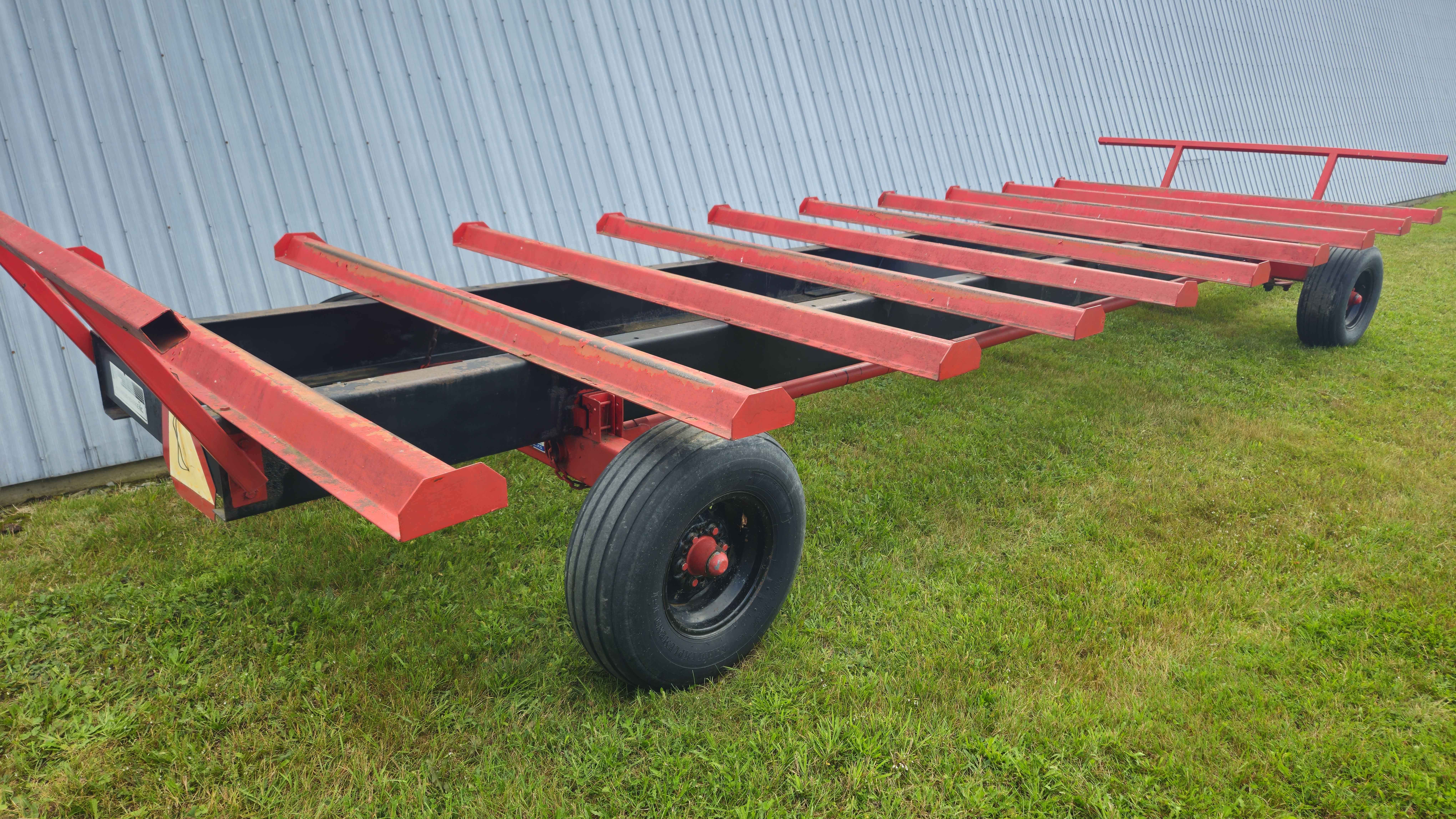 | Informations supplémentaires : Plate-forme à balles rondes de 24 pieds Modèle à travers boulonnés Ridelles avant et arrière Monté sur wagon Normand à 4 roues Conduite en triangle Timon télescopique |